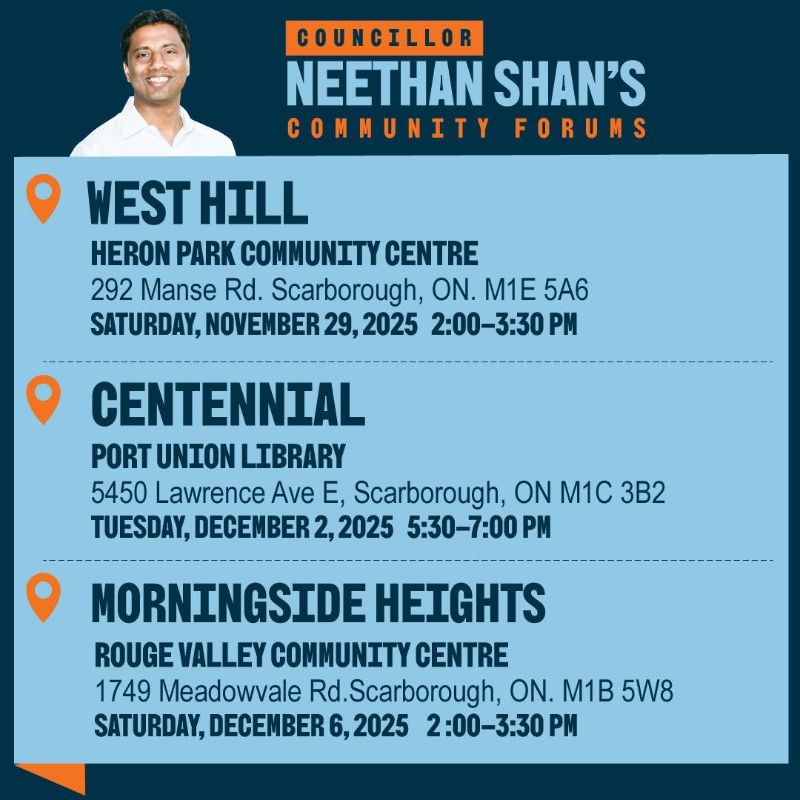 I want to hear from you. I’ve held community forums in Malvern, Highland Creek, and West Rouge. Upcoming forums will be held in West Hill, Centennial, and Morningside Heights. Our community forums are a place for residents to voice their concerns and solutions on neighbourhood matters. I will take your input and bring it to City Hall where your voice, Scarborough’s voice, will be heard.